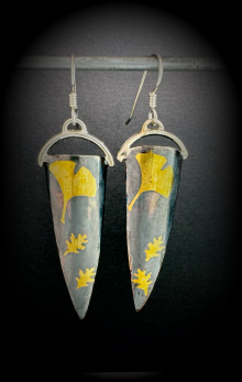 Dramatic Fused 24K Gold and Silver Dangle Earrings, Ginko Leaf Design Dagger Shape